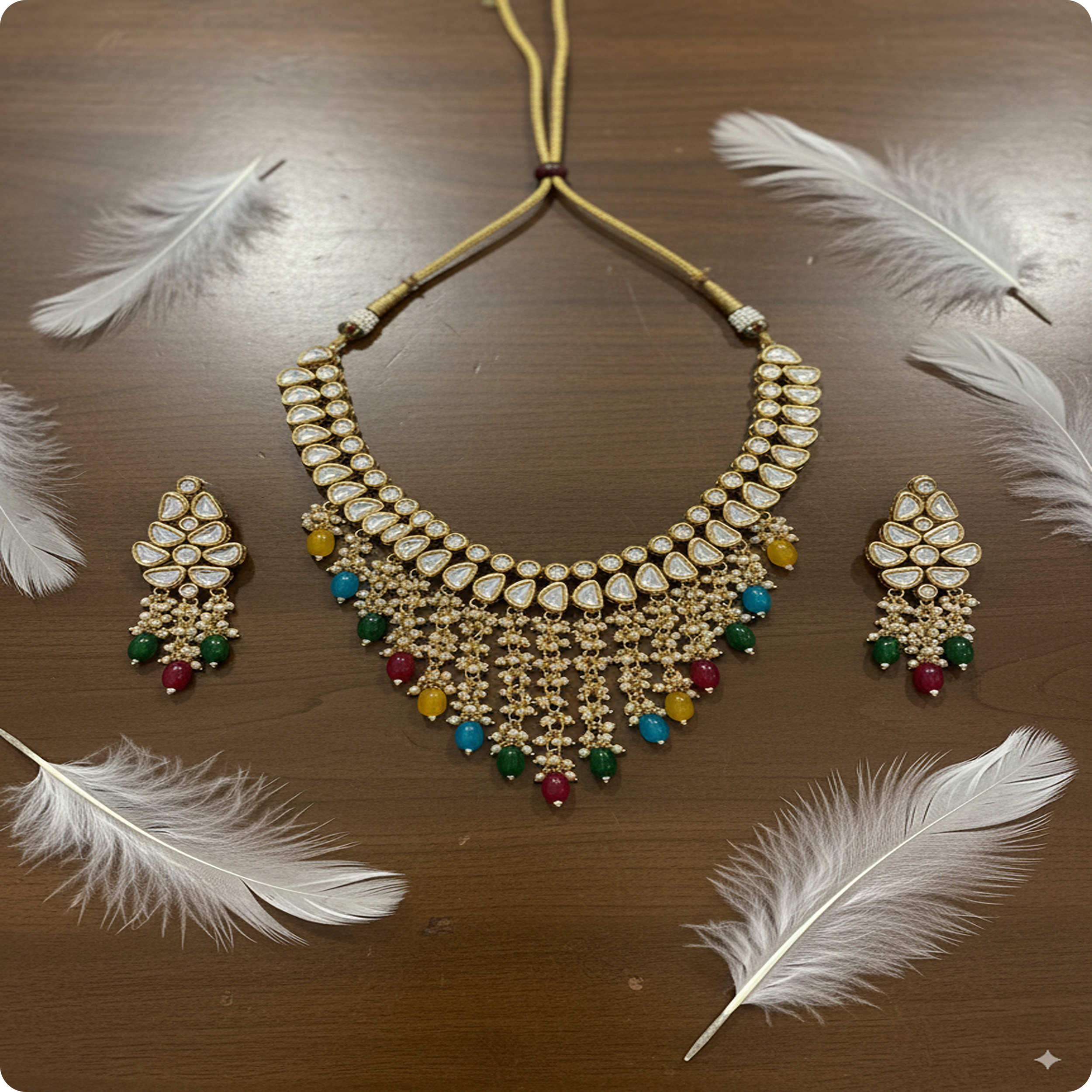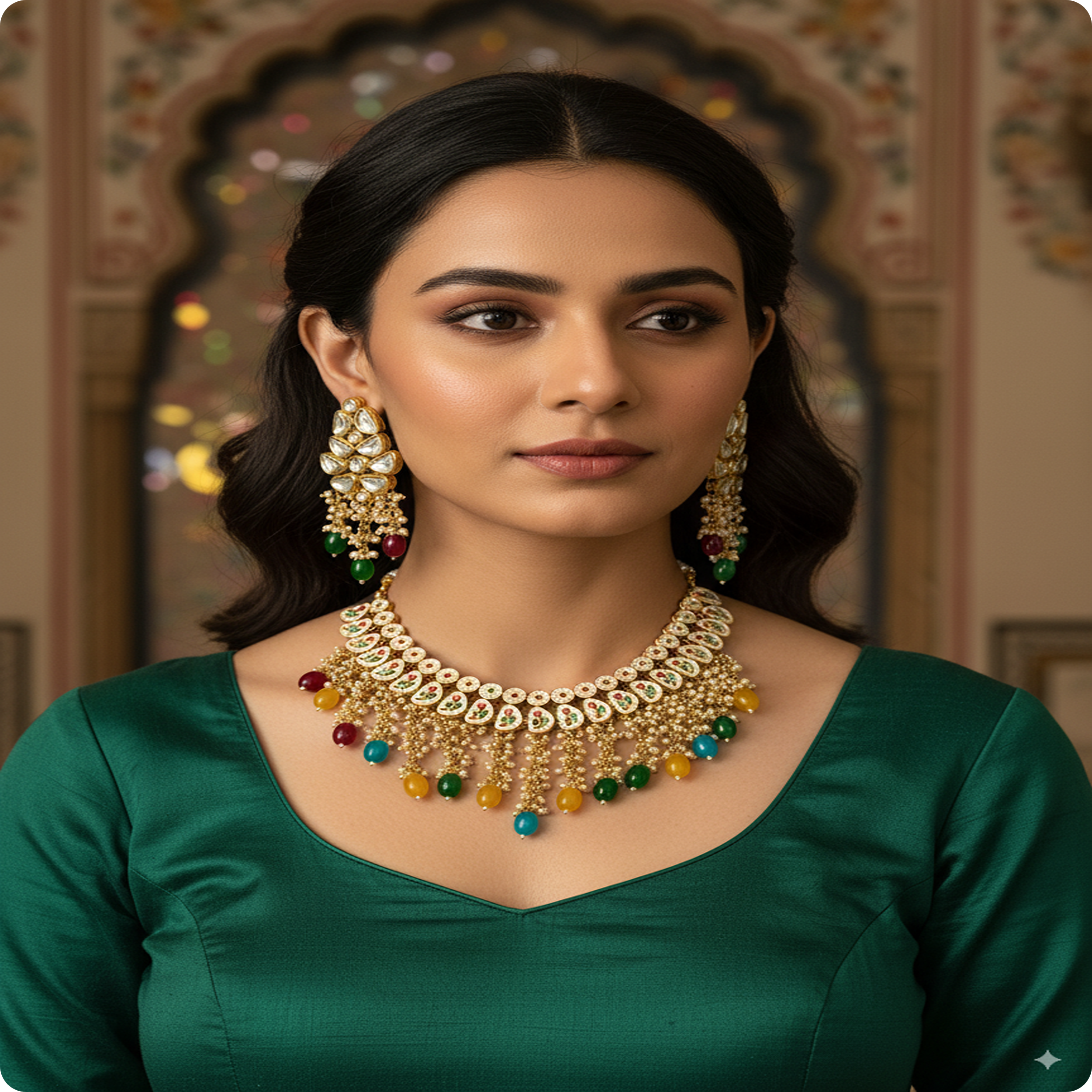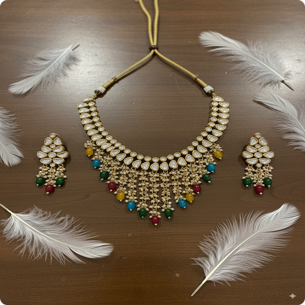 Add a royal charm to your jewelry collection with this Kundan Meenakari Multi Beads Set, crafted with real and premium quality stones. Its intricate design and colorful bead detailing make it a perfect blend of tradition and luxury—ideal for weddings, festive occasions, or bridal wear.