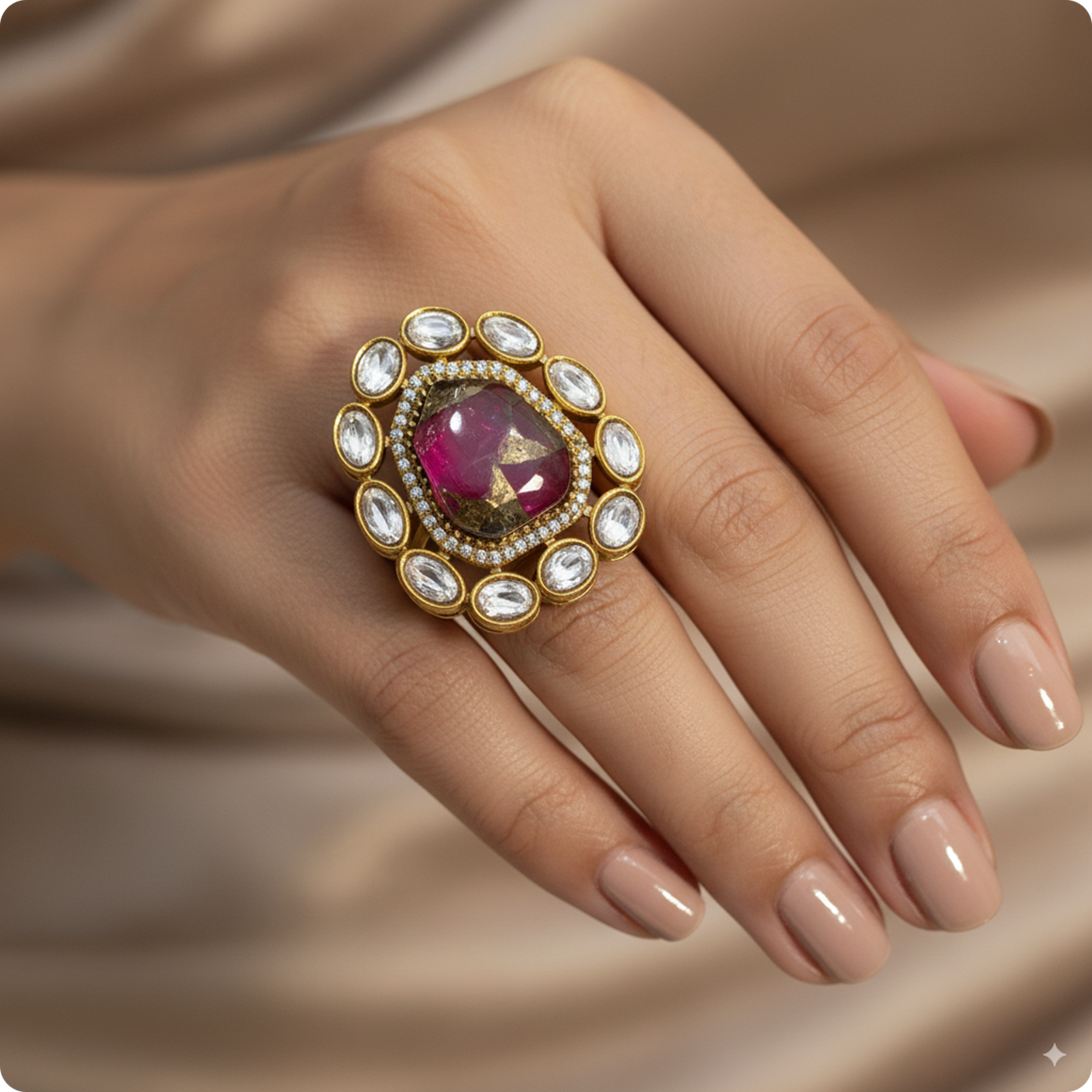 Turn every occasion into a royal affair with this hexagon emerald baby pink cocktail ring, a perfect blend of tradition and modern sophistication. π The bold emerald pink gemstone is beautifully framed by a sparkling diamond halo, set on a premium gold-plated band. Designed to complement festive attire, bridal looks, or glamorous evening wear, this ring is the ultimate show-stopping accessory. π