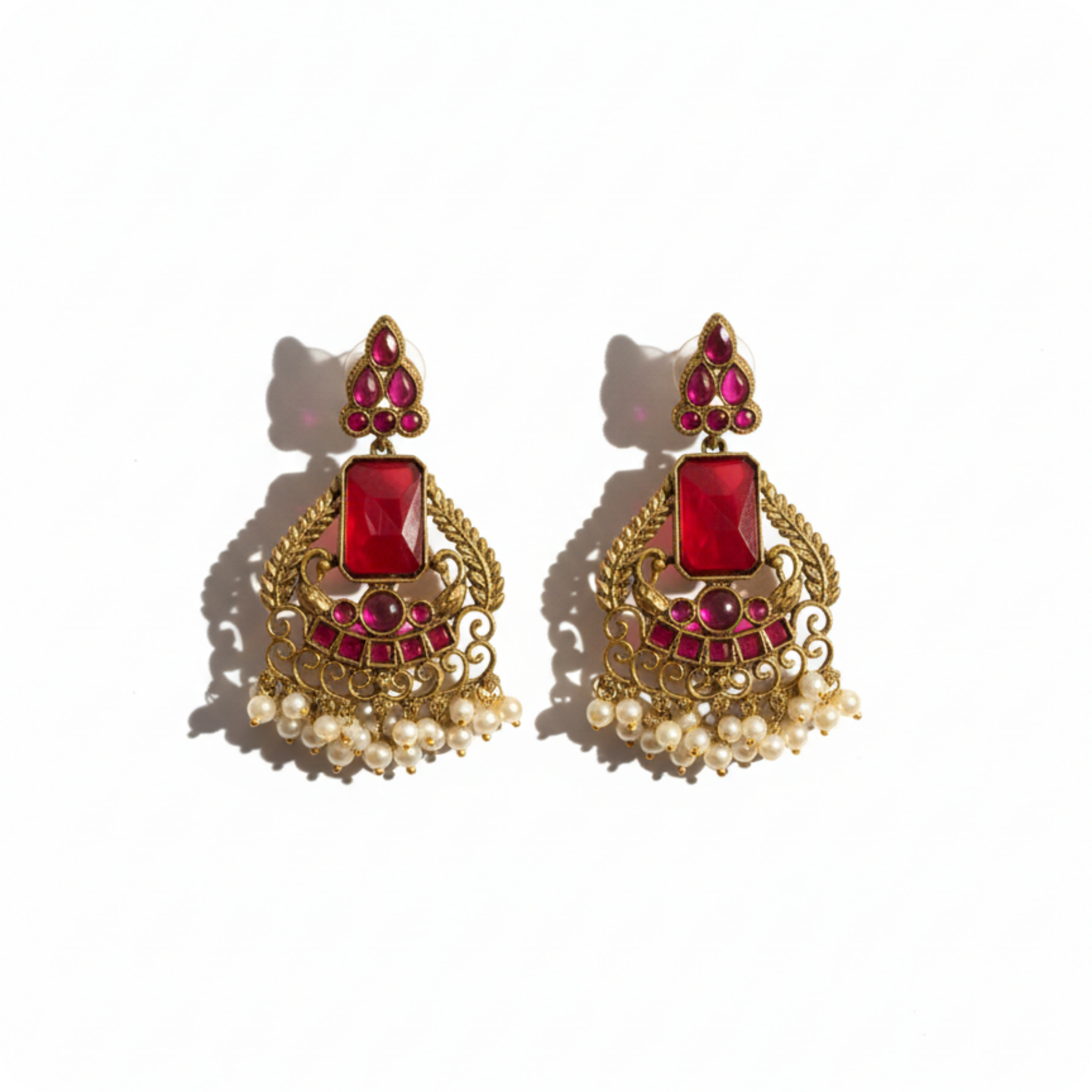 Featuring a bold ruby-red center stone set in ornate antique gold carving, this pair celebrates traditional Indian artistry with a luxurious modern touch. The intricate detailing, accented with sparkling ruby embellishments and a delicate row of handcrafted pearls, creates a statement piece that radiates elegance and grace.