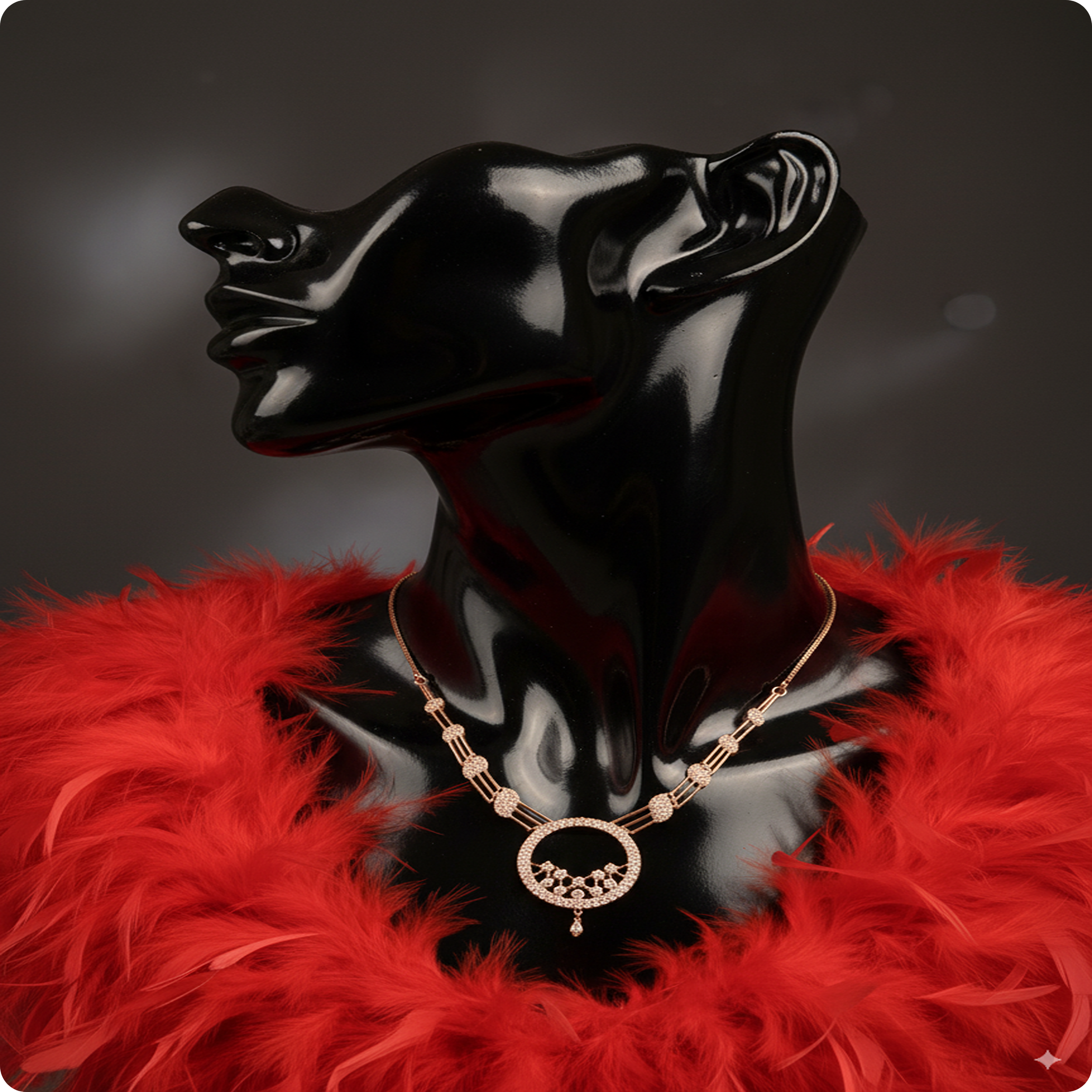 Add a touch of sophistication to your jewelry collection with this Rose Gold Finish American Diamond Necklace Set, designed with a sleek circular pendant and geometric sparkle. Crafted with precision, this minimalist yet striking set features fine American Diamonds (AD) set in a lustrous rose gold polish, delivering modern elegance with a traditional twist.