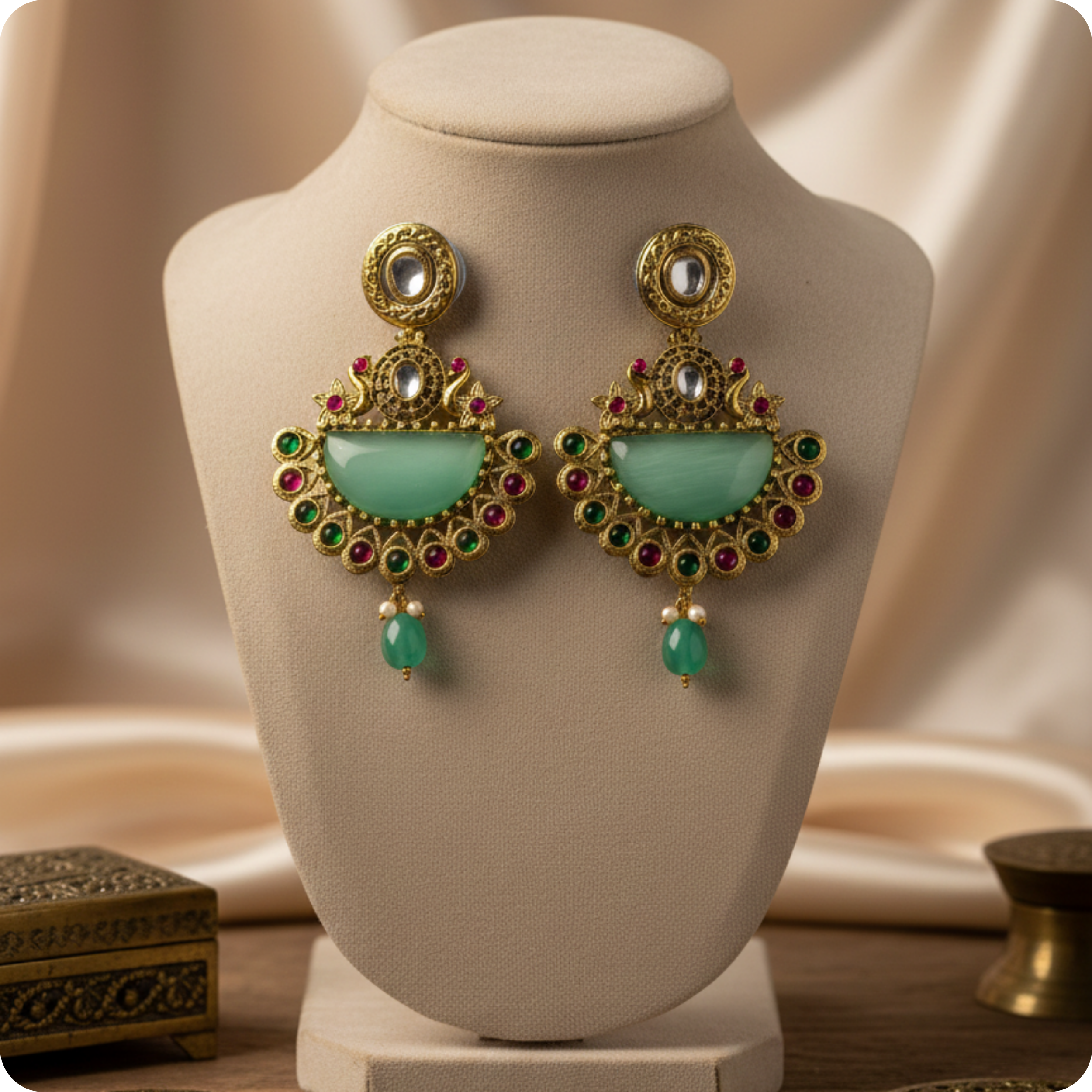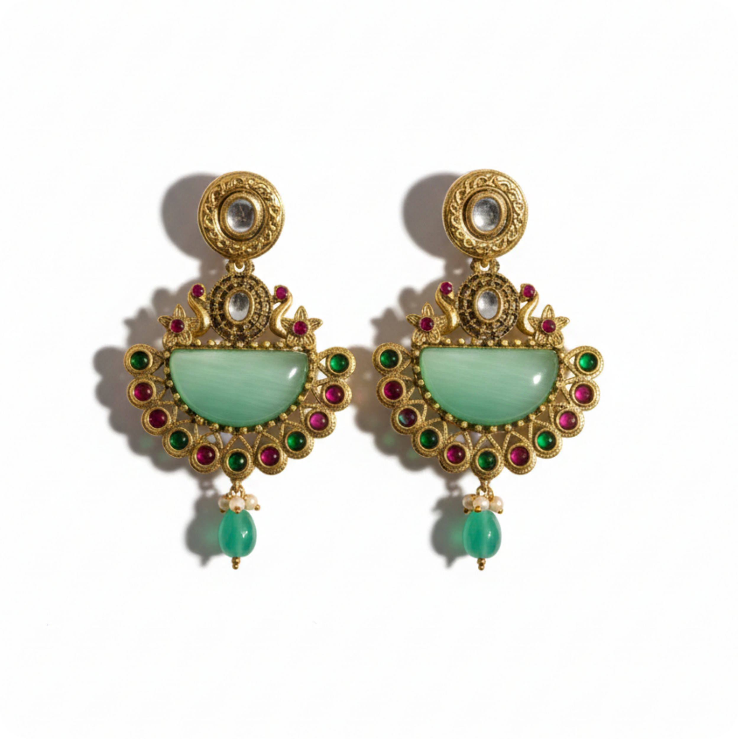 The intricate gold-plated structure, embossed motifs, and delicately placed gemstones make these earrings perfect for weddings, festive celebrations, traditional ceremonies, bridal wear, and grand ethnic events. Designed to be the highlight of any outfit, this statement jewellery pairs effortlessly with lehengas, sarees, shararas, and heavily embroidered ethnic attire.