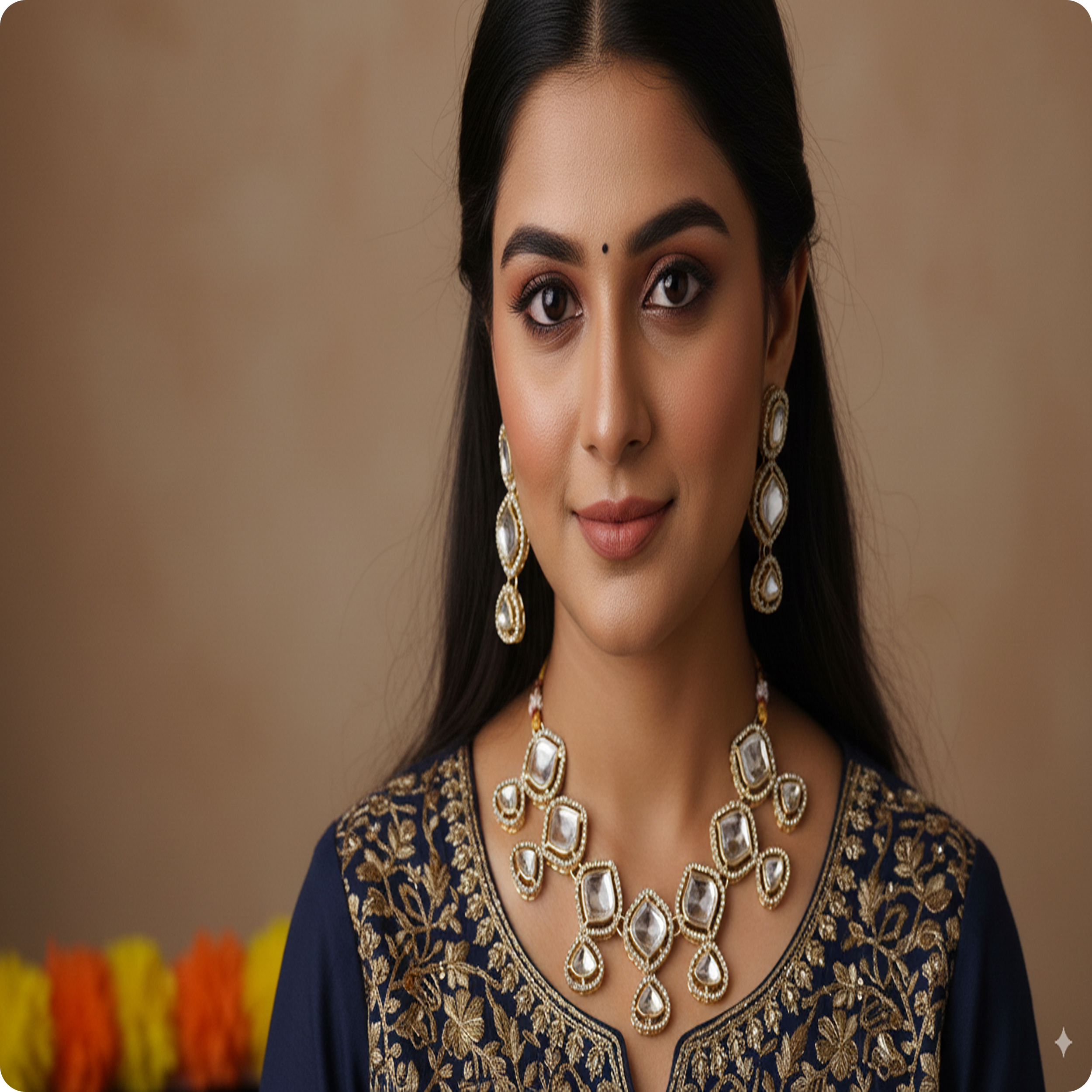 The bold polki-inspired design adds a rich traditional flair to your ensemble, making you stand out at any celebration. Ideal for brides, bridesmaids, or as a statement piece for wedding guests.