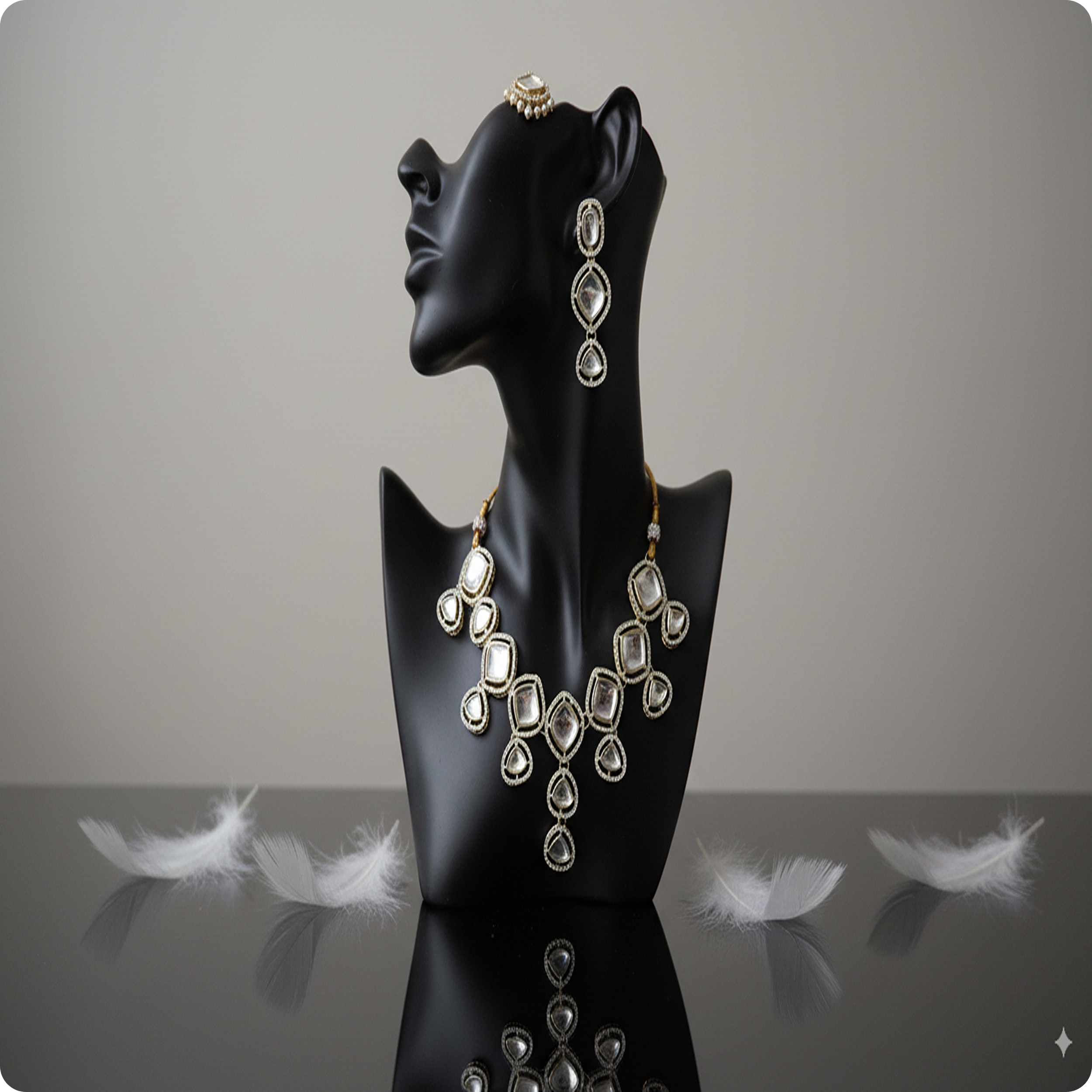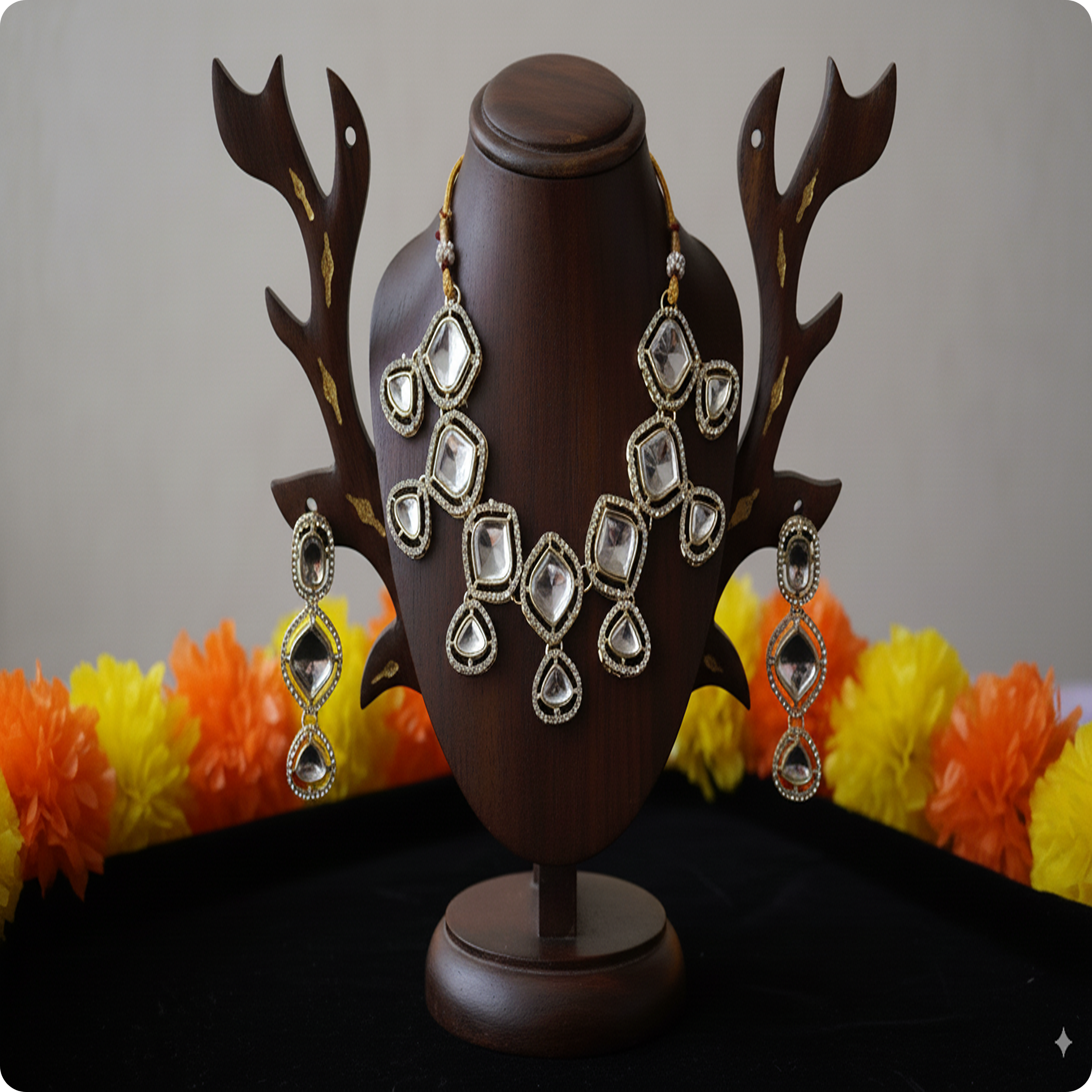 Radiate regal charm with this Royal Kundan Mirror Finish Necklace Set from Ashthi Jewels. Featuring a brilliant array of diamond-cut mirror stones bordered with intricate white stone detailing, this handcrafted piece is perfect for bridal, festive, or party wear.